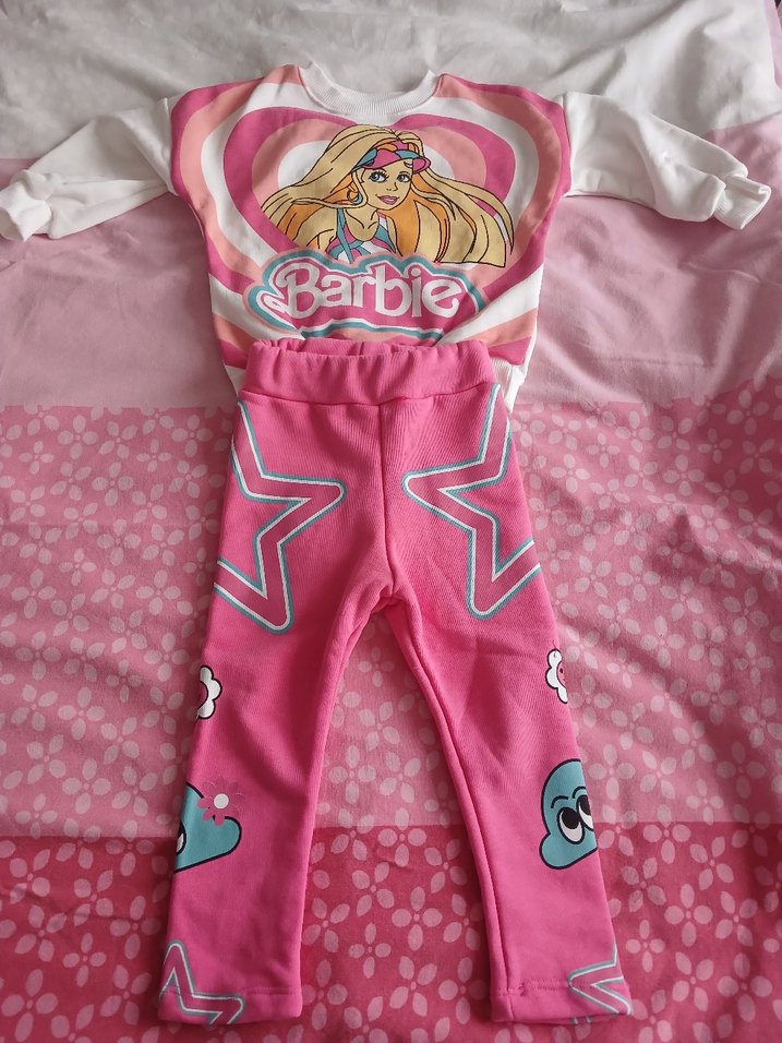 Rahat kesim, pembe eşofman üstü ve altı, renkli Barbie baskılı ve örme detaylı, yumuşak ve sıcak kumaştan. Trendy günlük stil için uygun.