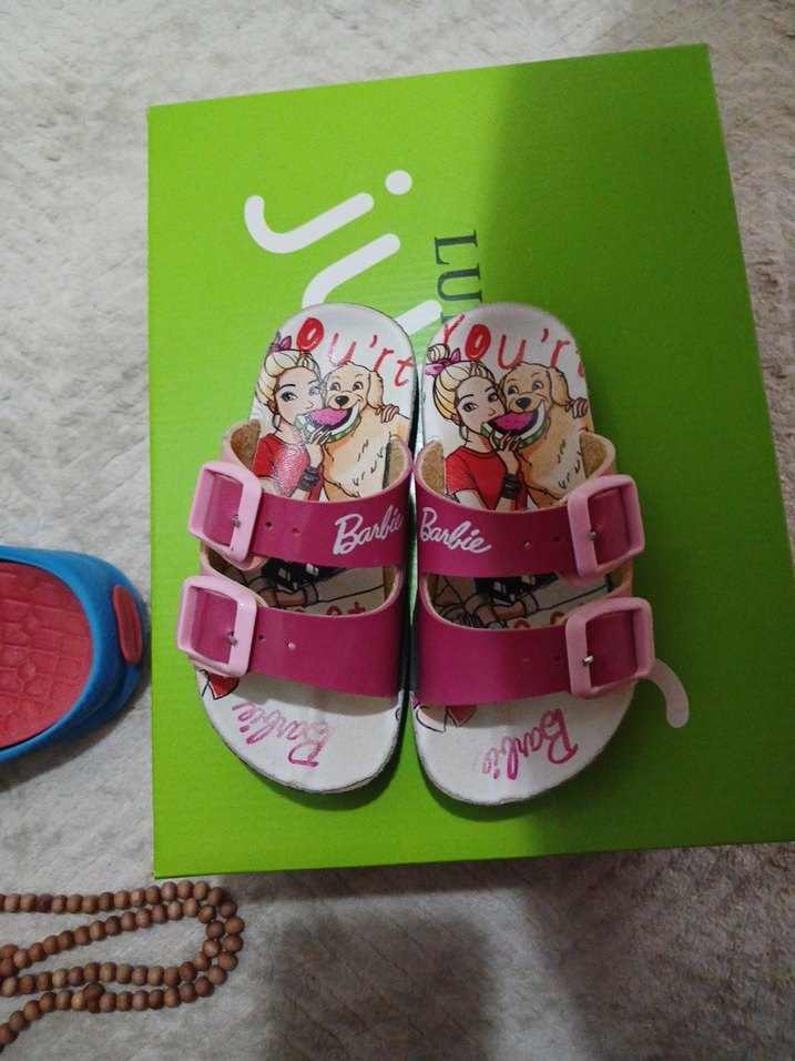 Barbie baskılı, renkli kız çocuk terliği, pembe tokalı kayışlarla ve kauçuk malzemeden üretilmiştir. Trendy ve rahat kullanım için uygundur.