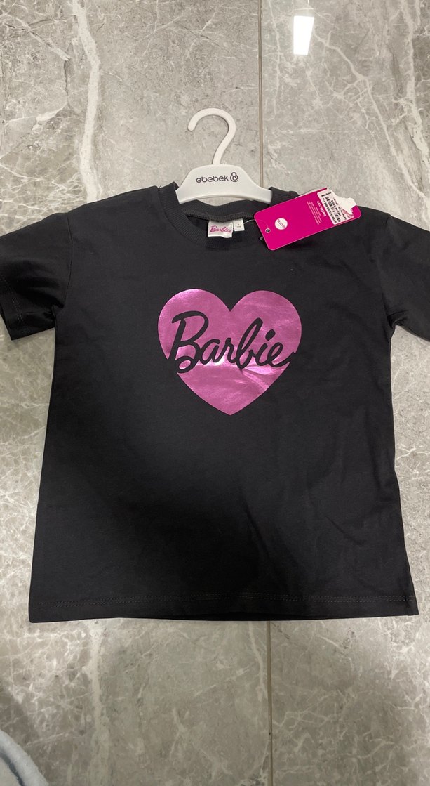 Siyah, kısa kollu, yuvarlak yakalı kız tişörtü, bol kesim ve önünde pembe Barbie baskısı bulunur. Yumuşak ve sıcak kumaştan üretilmiştir. Hiç kullanıl