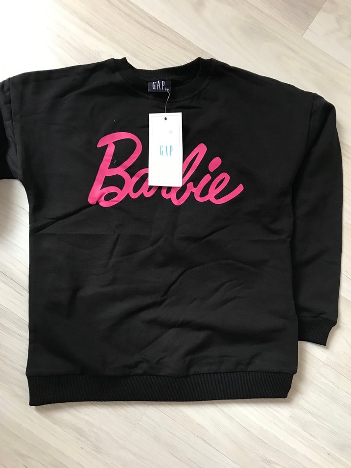 GAP markalı bu siyah sweatshirt, uzun kollu, bisiklet yaka kesimdir. Önünde pembe Barbie baskısı bulunur. Yumuşak Pamuk penye kumaştan üretilmiştir. 7-8 yaş.