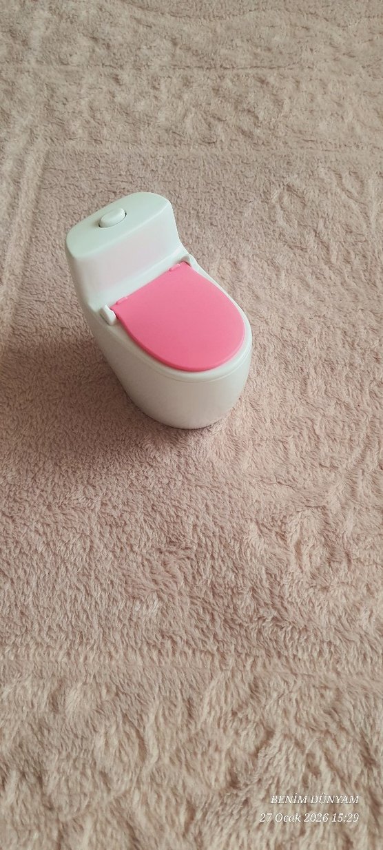 ustteki dugmeye basinca sifon cekme sesi geliyor.barbie bebek uyumlu klozet