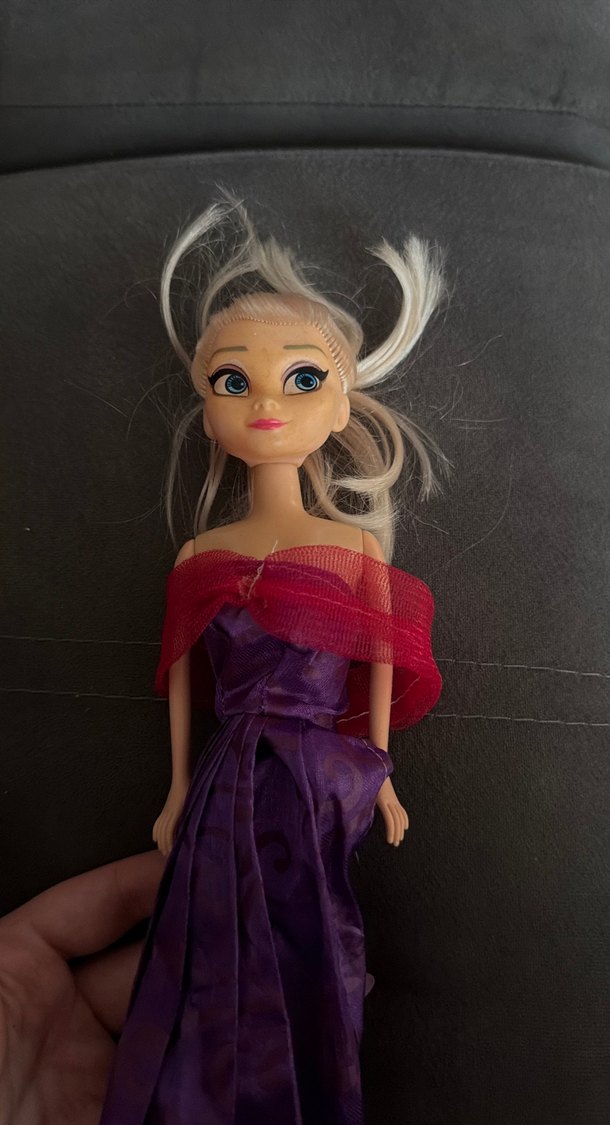 Bu bebek koyu mor elbise ve kırmızı şeffaf şal ile giyilmiş. Sarı saçları ve büyük mavi gözleri bulunur. Kıyafeti şık kumaş ve canlı kırmızı detay içerir.