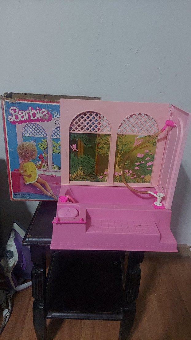 Barbie pembe oyuncak banyo seti, duş ve lavabo içerir. Pencere tasarımlı arka plan ve çiçekli sahne bulunur. Hayal gücü oyunları için uygundur.