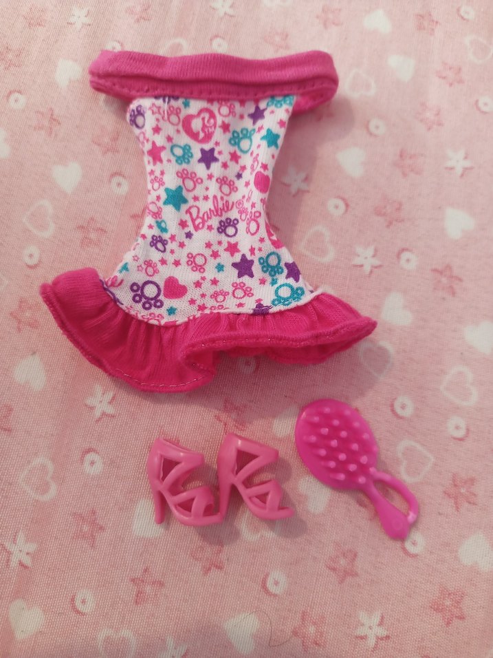 Renkli desenlere sahip pembe Barbie bebek elbisesi, uyumlu pembe ayakkabılar ve saç fırçasıyla birlikte. Bebek oyunları için uygun .
