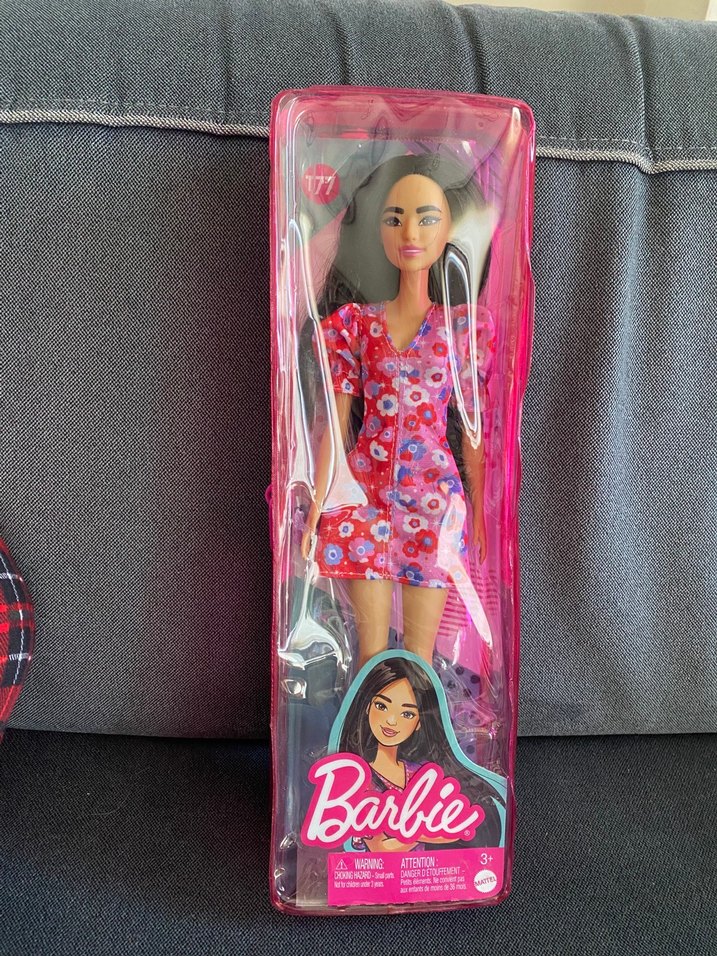 Barbie bebek, kısa kollu pembe çiçekli elbise giymiş, şeffaf kutuda paketlenmiş.