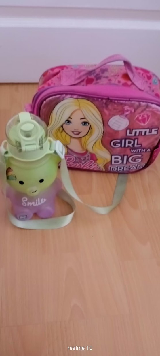 Pembe pastel renkte, üzerinde kız ve 'Little Girl with a Big Dream' yazısı bulunan okul çantası. Ayıcık figürlü su şişesi ve askısı ile birlikte. suluk hediye kilit yerinde düşme var ama kullanıma engel durum yok sızdırma koku yapmıyor