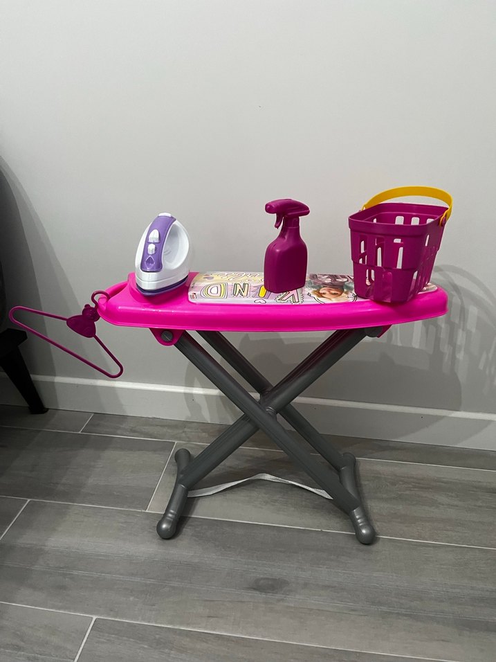 Koyu pembe renkli çocuk ütü masası, küçük ütü, sprey şişesi, askı ve sepet içeren oyun seti. Sıfırdan farksız
