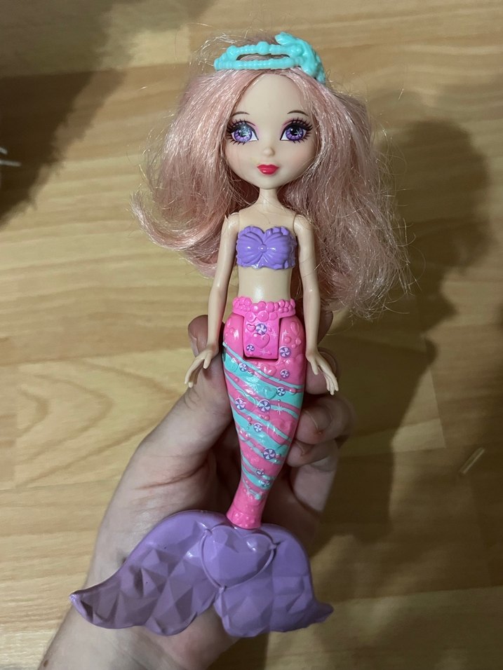 Pastel pembemsi deniz kızı bebek, detaylı yüz ifadeleri ve mavi ile mor renkli kuyruğa sahip. Mavi saç aksesuarı ve deniz kızı kuyruğu şeklinde mor stand içerir. ♀️