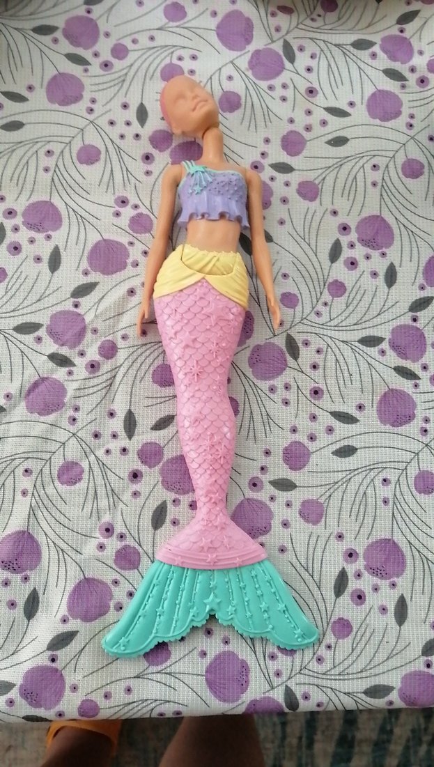 Barbie dokulu kuyruk ve fırfırlı üst kısmıyla mor, sarı ve turkuaz renklerde deniz kızı bebek. ♀️