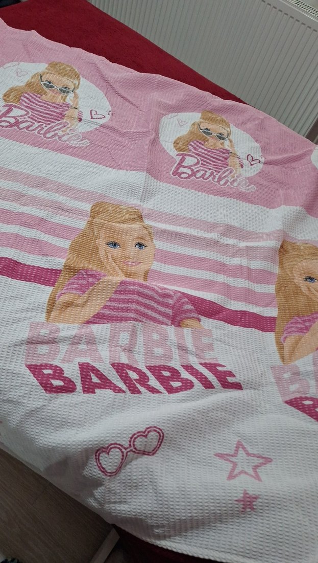 boyu 175 cm çocuk battaniyesi, yumuşak sentetik kumaş üzerine pastel pembe tonlarda baskılı Barbie desenine sahiptir. Çocuk odalarına rahat ve renkli bir dokunuş sağlar. ️