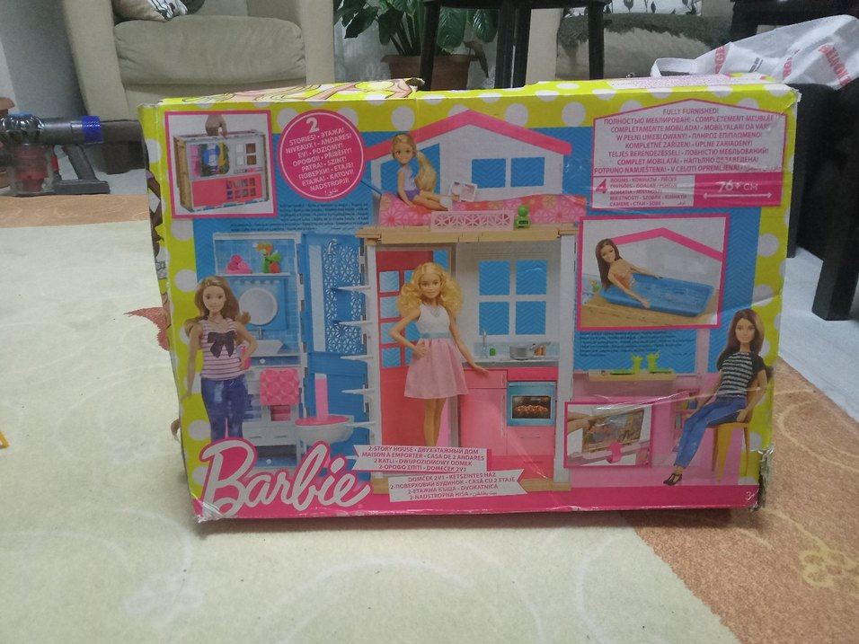 Barbie oyun seti, mutfak ve oturma alanları içeren pastel pembe ev ve aksesuarlarla birlikte gelir. Hayal gücünü destekler. Hiç kusuru yok, neredeyse hiç kullanılmadı. aksesuarları tam.