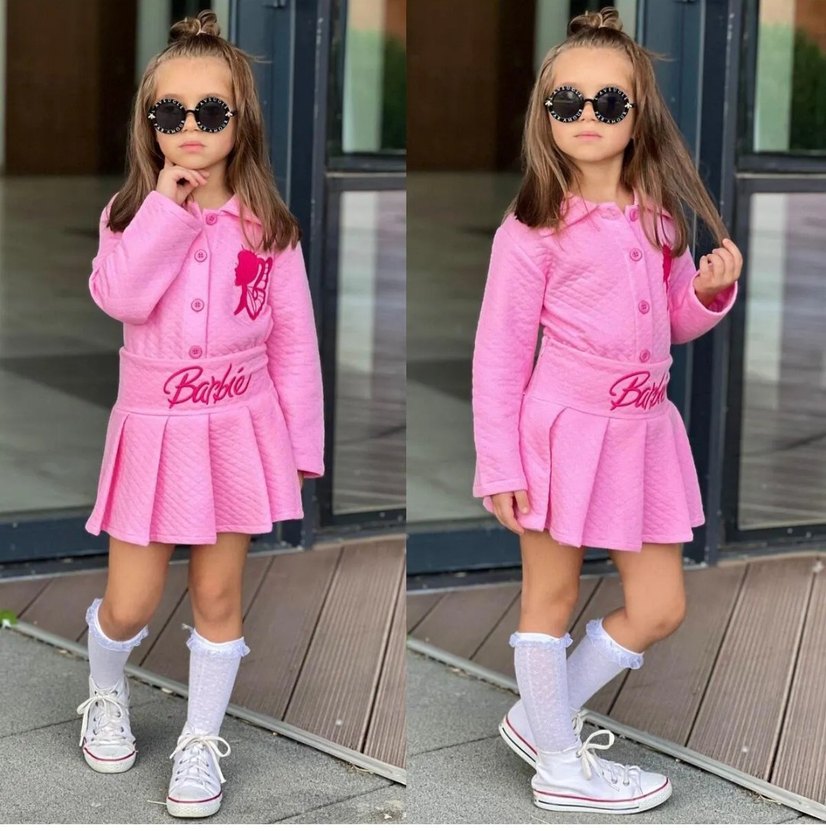 Pembe kapüşonlu, düğmeli ve uzun kollu bolero, Barbie nakış detaylarıyla. Yumuşak ve sıcak kumaştan yapılmıştır, trend sokak giyimi için uygundur.
