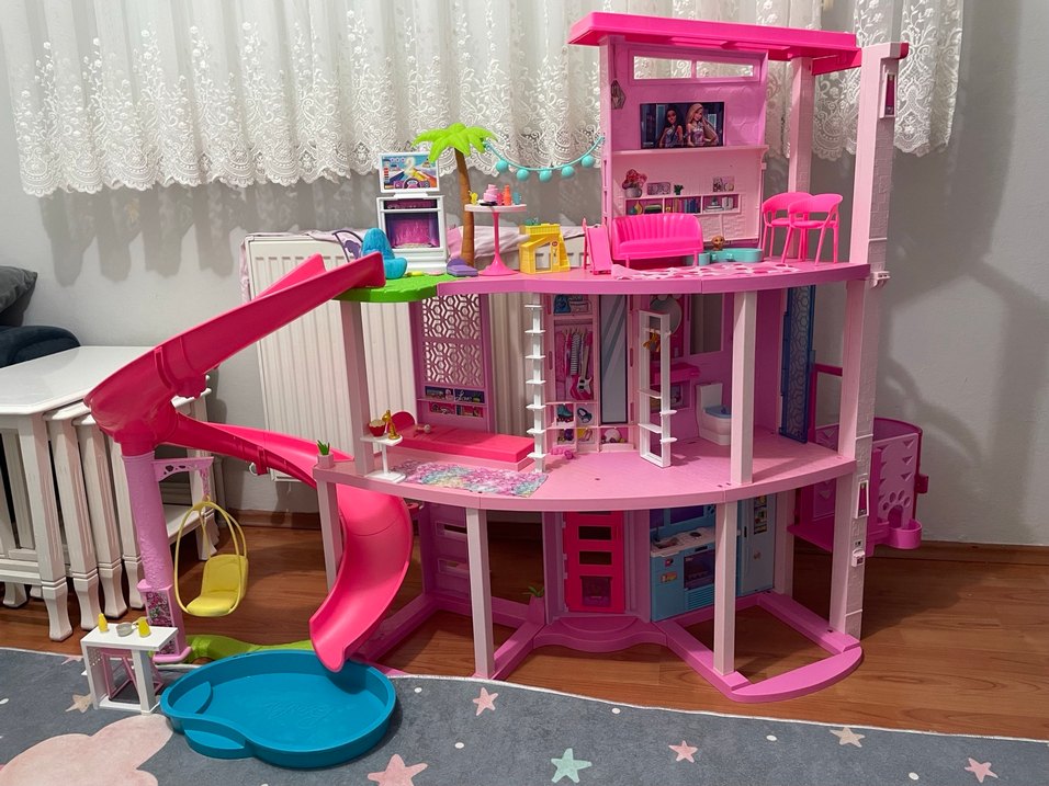 Çok katlı, kaydıraklı büyük pembe oyun evi, küçük mobilyalar ve havuz alanı ile hayal gücünü destekler. 1 sene önce alındı kızımın ilgisini çekmedi odada duruyo hiç bi sorunu yok tüm aksesuarları tamdır