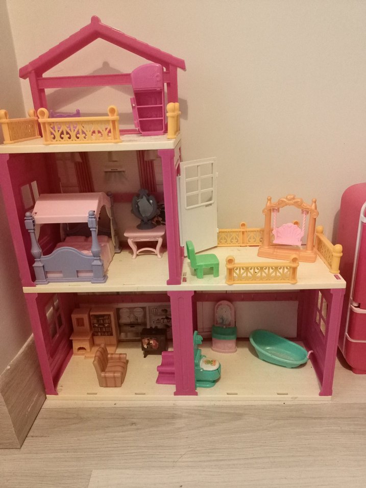 Pastel pembe oyuncak ev, içinde küçük mobilyalarla birlikte yatak, küvet ve sandalyeler bulunan çok odalı bir yapıya sahiptir. esyalariyla gonderilicektir polly pocketler Chelsea ler icin idealdir klozette catlak var sadece