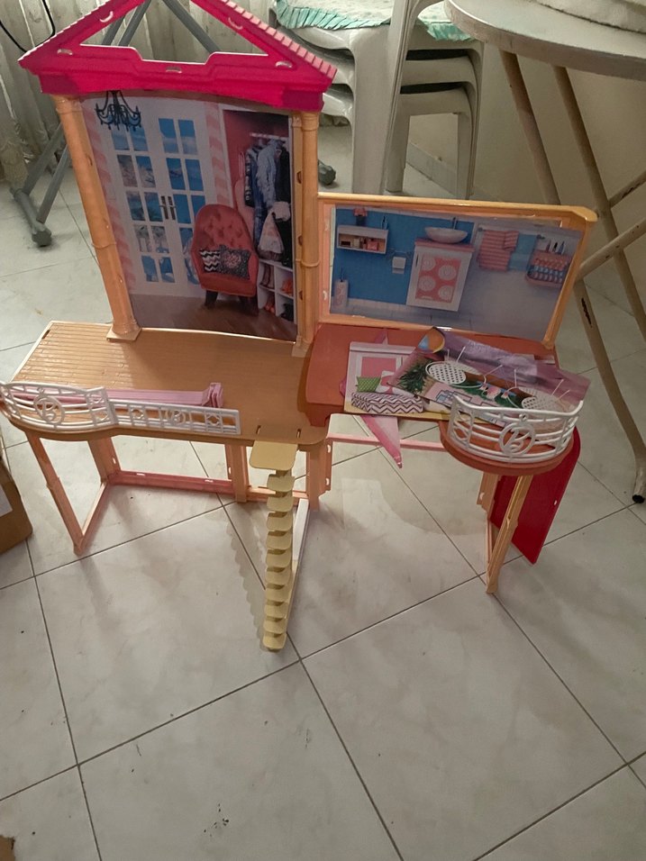 Pembe pastel renkli oyuncak ev seti, detaylı iç mekan baskıları ve balkonlarıyla hayal gücünü destekler.eşyaları yok