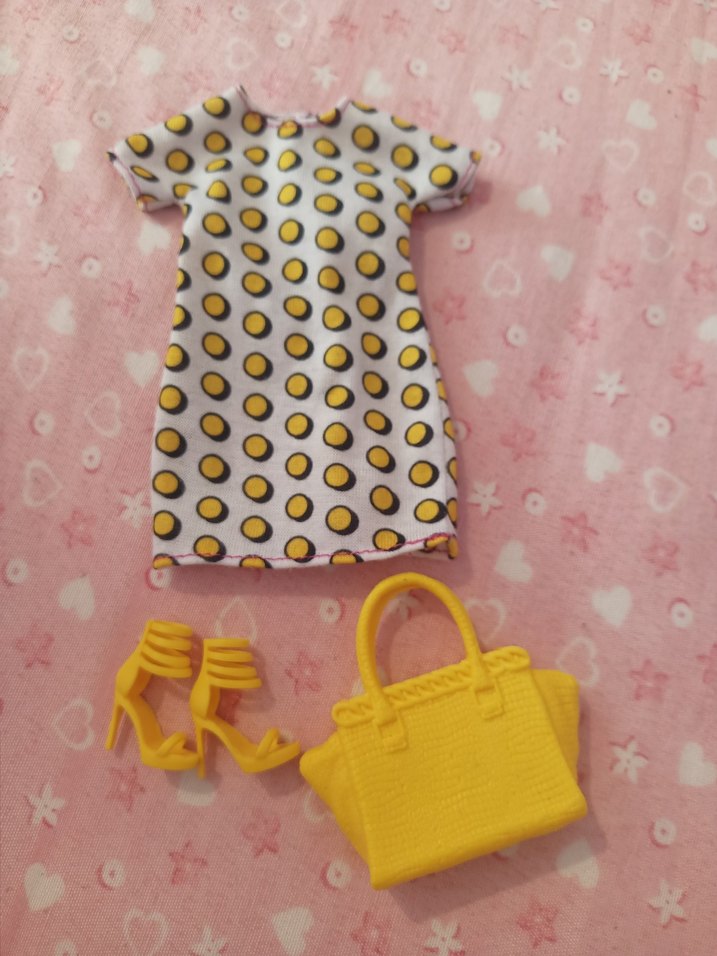 Sarı puantiyeli elbise, sarı topuklu ayakkabılar ve sarı çantadan oluşan renkli bebek kıyafet seti.