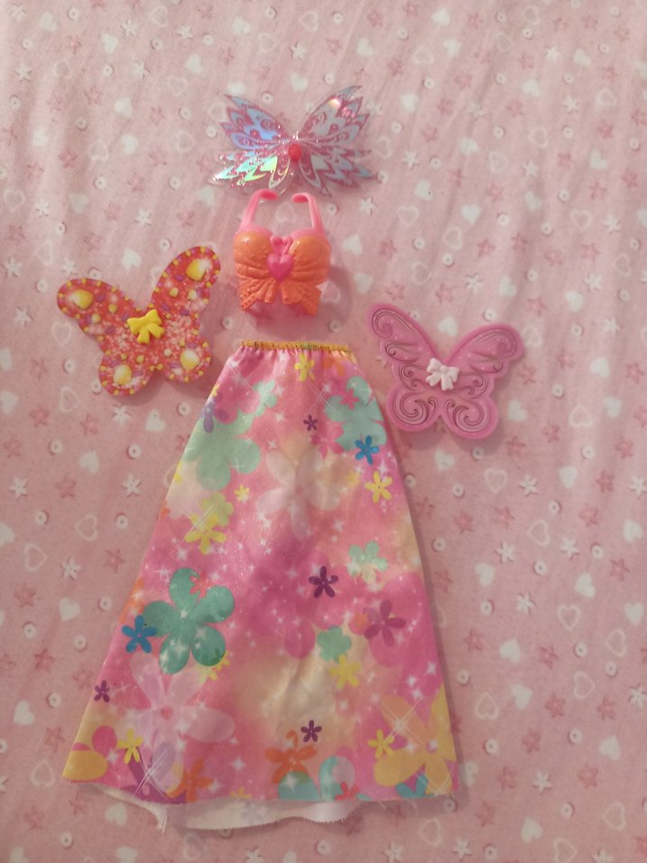 Pembe pastel renkli, çiçek desenli uzun etek ve kelebek detaylı üst kısmı olan bebek elbisesi ve kelebek aksesuarları içerir.