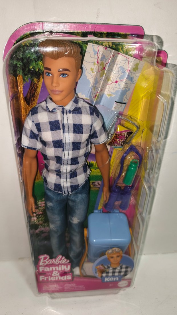 Barbie Ken bebek, kareli gömlek ve kot pantolon giymiştir. Yanında valiz ve harita gibi seyahat aksesuarları bulunur.