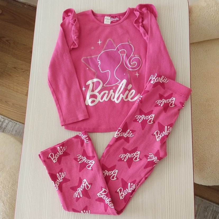6-7 yaş pembe Barbie sweatshirt takımı, uzun kollarda fırfır detaylı ve bol kesimdir. Yumuşak ve sıcak kumaştan üretilmiştir. Bisiklet yaka üst ve baskılı pantolon Barbie logosu ve figürü taşır.( göründüğü gibi ilk fotoğrafta pantolonun paçasında minicik bir kalem izi mevcut muhtemelen çıkacak bir leke sorunsuz.)