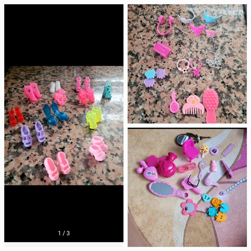 Pembe ve canlı renklerde minyatür ayakkabılar, taraklar ve takılar içeren renkli oyuncak aksesuar seti. Hayal gücünü destekler.