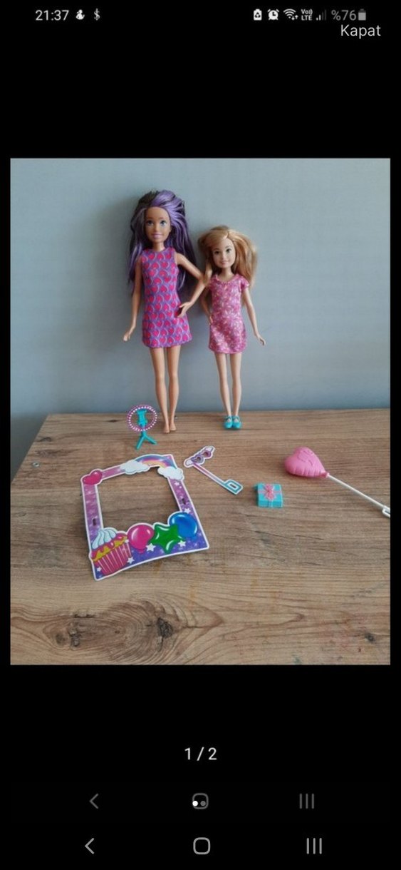 Pastel pembe elbiseler giymiş iki bebek ve çerçeve, güneş gözlüğü, kalp şeklinde aksesuarlar içeren oyuncak seti.