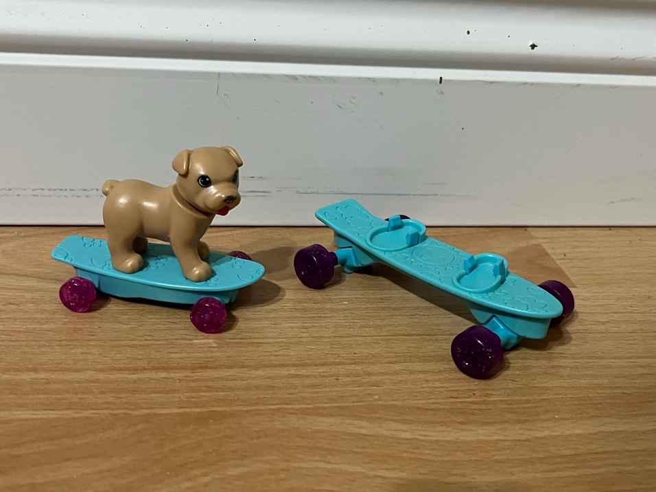 Mavi kaykay ve tekerlekli küçük köpek figürlü itme çekme oyuncak, çocukların oyun keyfi için.