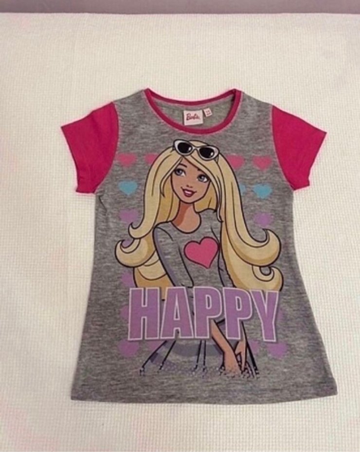 Kız çocukları için bol kesim, gri renkli, kısa kollu ve bisiklet yaka tişört. 'HAPPY' yazılı renkli pop kültür baskısı ve örme sentetik kumaştan üretilmiştir. Barbie marka 7-8 yaş tişört