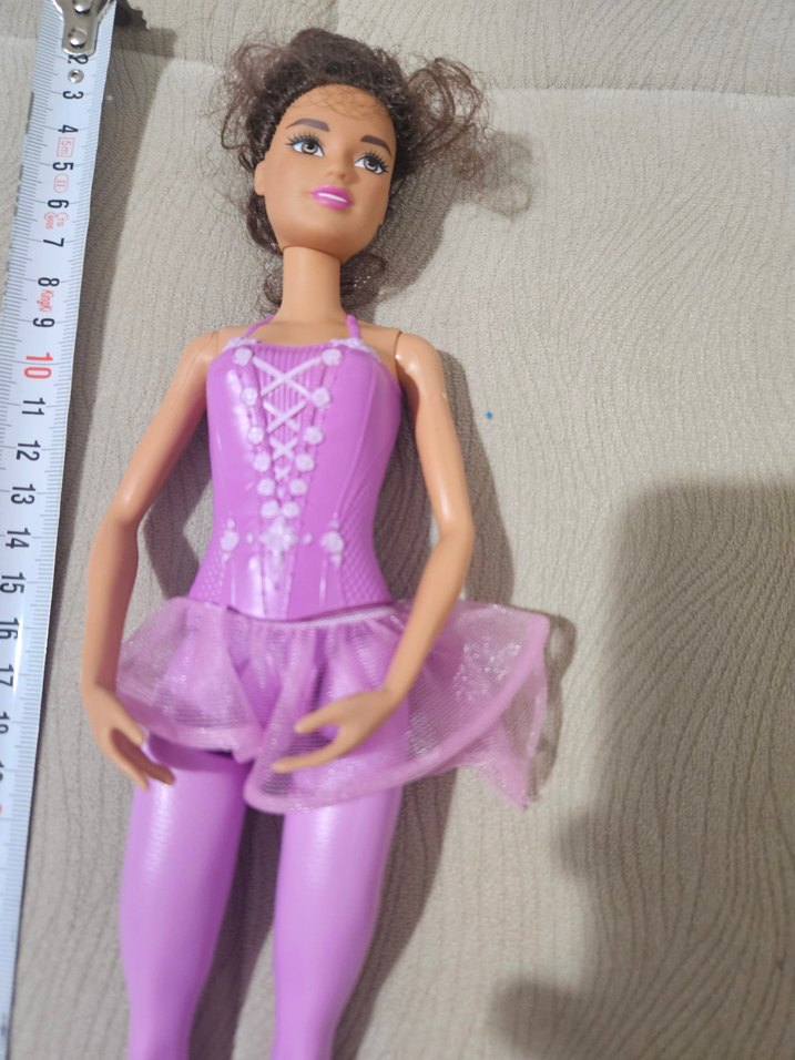 Barbie bebek, pastel mor bale kostümü ve tül etek ile yaklaşık 27 cm boyundadır.