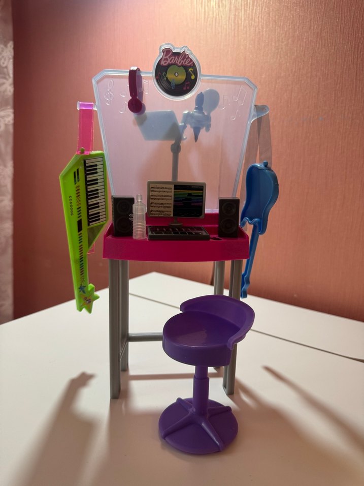 Pembe masa üzerinde laptop, hoparlörler, mikrofon ve yeşil klavye ile mavi keman bulunan Barbie müzik seti. Mor bir sandalye eşlik eder.