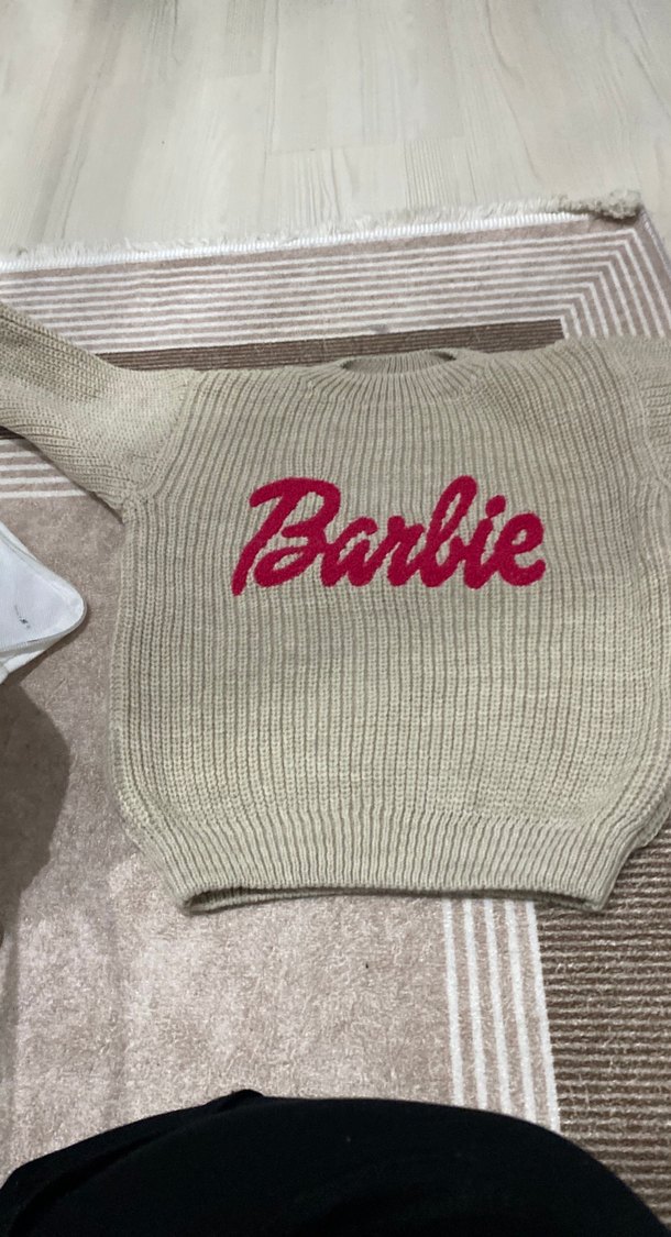 Uzun kollu, yuvarlak yaka, gri renkli ve kırmızı "Barbie" nakışlı kız triko kazak. Rahat ve şık bir sokak stili parçası.