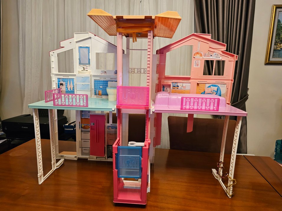 Barbie'nin Muhteşem Malibu Evi. Bazı kısımlarda kırıkları var, fotoğraflarda görülmektedir. Boyu 72 cm dir. Fotoğraflarda görüldüğü şekli ile satılmaktadır, ilave bir parça bulunmamaktadır.