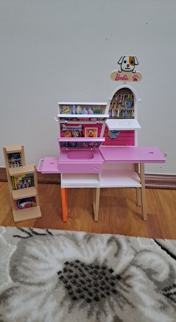 Pastel pembe renkli, çok raflı çocuk oyun masası ve küçük gösterim rafı. Üstünde köpek resmi ve Barbie logosu var. Ayrı üç katlı ahşap raf içerir.