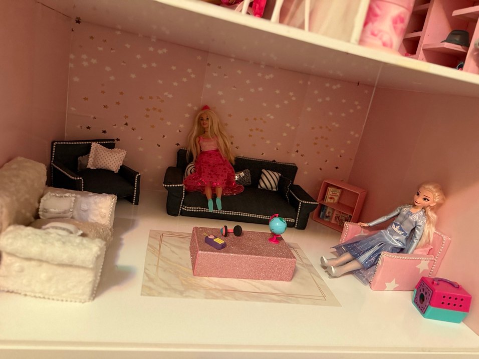 Parlak pembe elbiseli, uzun sarı saçlı oyuncak bebek siyah minyatür kanepede oturuyor. Çevresinde simli pembe masa ve mavi küre var.