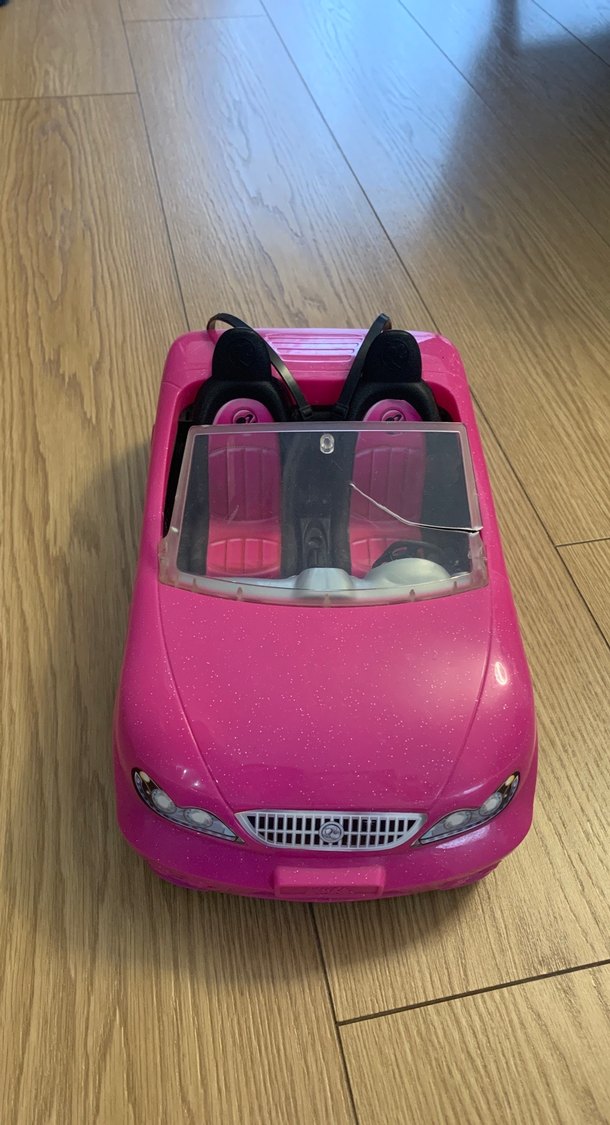 Parlak pembe renkte, iki kişilik oturma alanı ve şeffaf ön camı olan oyuncak araba.