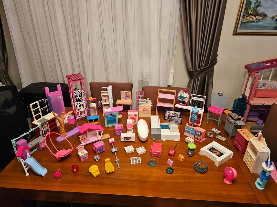 Çeşitli minyatür ev eşyaları ve mobilya parçalarından oluşan açık pembe oyuncak seti. Farklı barbie oyuncakları, set parçaları satılmaktadır. Görüntüde yer alan ürünlerin hepsi toplu olarak veya talebe göre ayrı ayrı satılmaktadır. Sergilenen alana sığdığı kadarı ile yerleştirilmiştir, farklı oyuncakları da olup ayrıca satışa çıkılacaktır. Kızım büyüdüğü ve artık oynamadığı için satılmaktadır. (Görüntü net değil ise veya daha detaylı foto talep edilirse iletilecektir.)