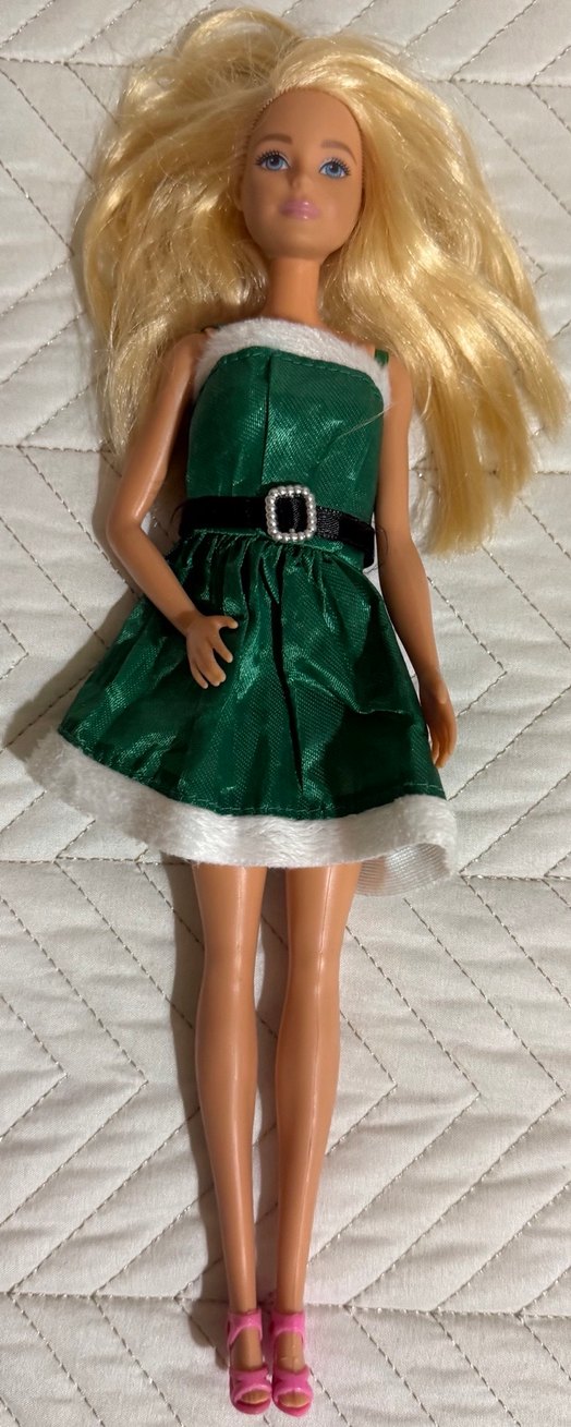 Oyuncak bebek, parlak yeşil elbise ve siyah kemer üzeri süslü tokayla. Elbisenin yakası ve etek ucu beyaz detaylı.