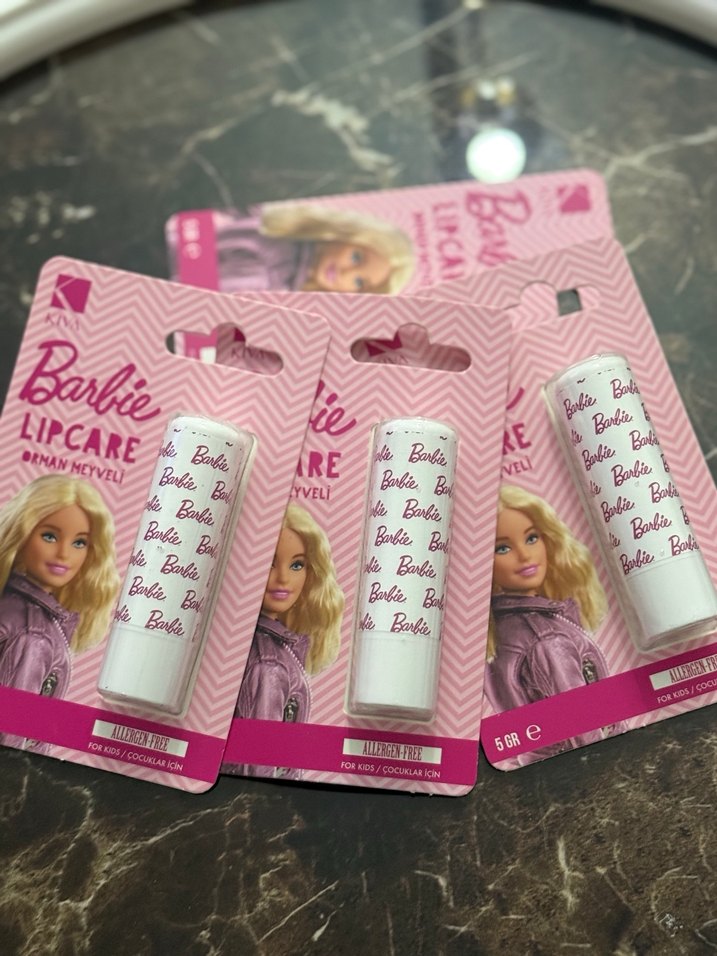 Barbie pastel pembe renkli, nemlendirici özellikli çocuklar için dudak bakım sticki. Ambalajda Barbie resmi ve üründe tekrar eden marka yazısı bulunur.