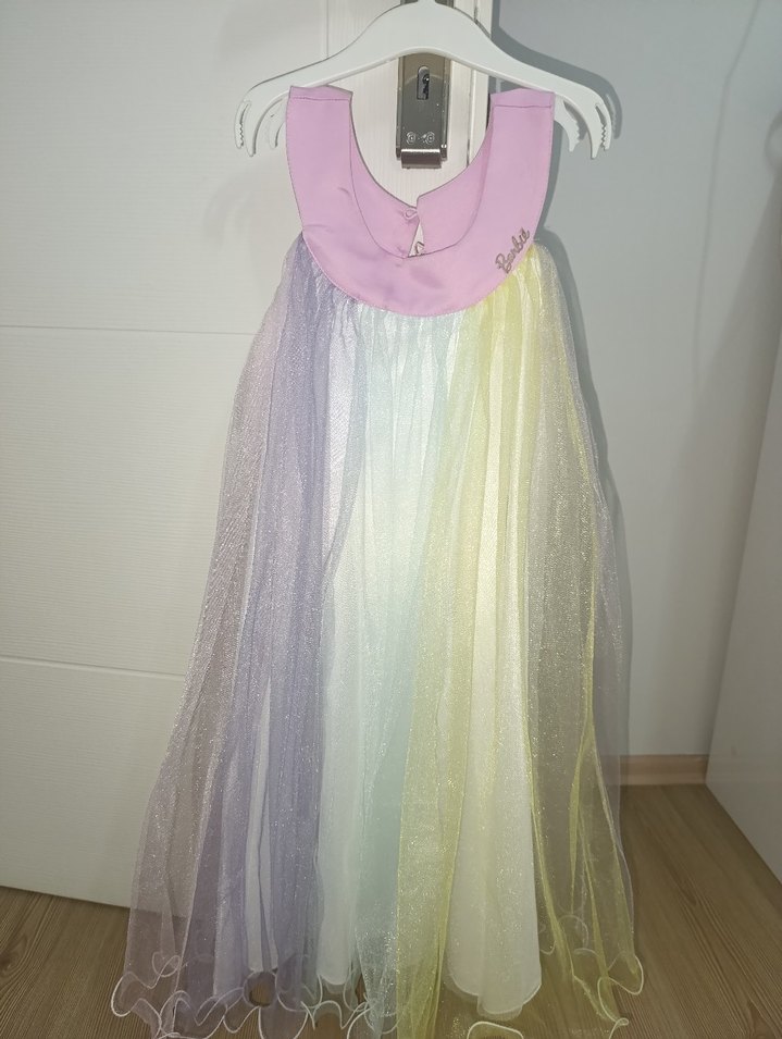 Kolsuz, straplez yaka ve bol kesim kız elbisesi, pastel renklerde tie-dye desenli. Yumuşak sentetik kumaştan, drapeli ve bohem tarzda. sıkıntısı sadece Barbie yazısı nedendir deformeli başka hiç bir sorunu yoktur 1 kere doğum gününde kullanildi
