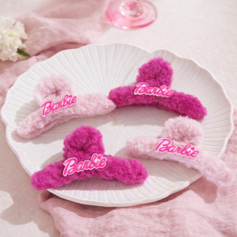 Peluş malzemeden yapılmış, Barbie logosu detaylı renkli ve yumuşak pembe saç tokaları. Rahat ve şık bir görünüm sunar.