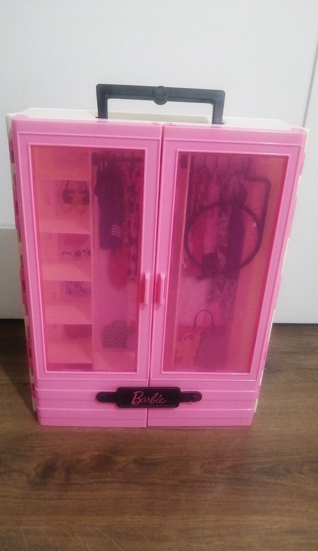 Barbie pembe oyuncak gardrop , şeffaf kapaklı ve taşıma saplı. Raflar ve askılıklar aksesuarlar için uygundur. Sadece dolap kıyafetler ve aksesuarları resimdir