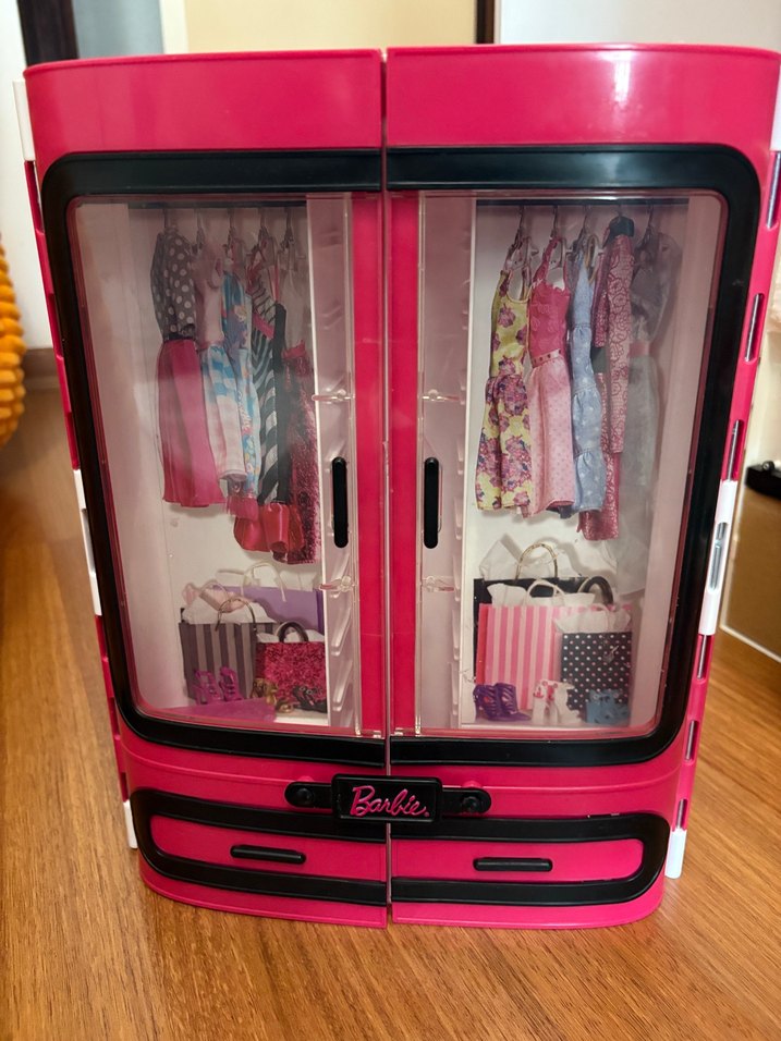 Renkli elbiseler ve aksesuarlar içeren pembe Barbie çocuk dolabı, şeffaf kapaklıdır. Çocuk kıyafetleri ve oyuncakları için uygundur.