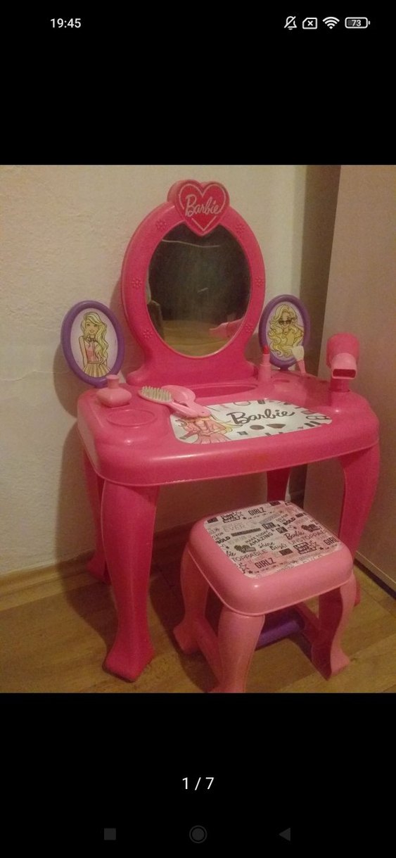 Pastel pembe Barbie temalı çocuk şifonyeri, ayna, plastik makyaj ürünleri ve baskılı tabure içerir. Bazı makyaj malzemeleri eksiktir görsellerde mevcut.