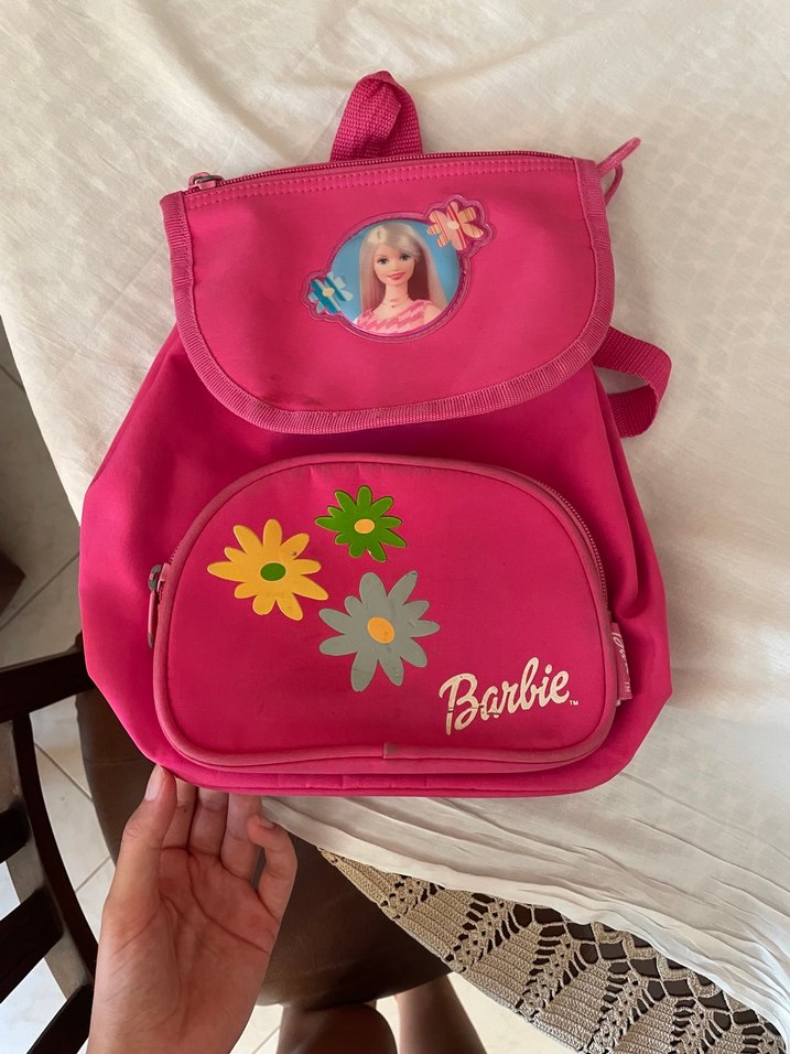 Renkli pembe çocuk sırt çantası, Barbie baskısı ve çiçek desenlerine sahiptir. Önünde fermuarlı cep ve kapaklı bölme bulunur.