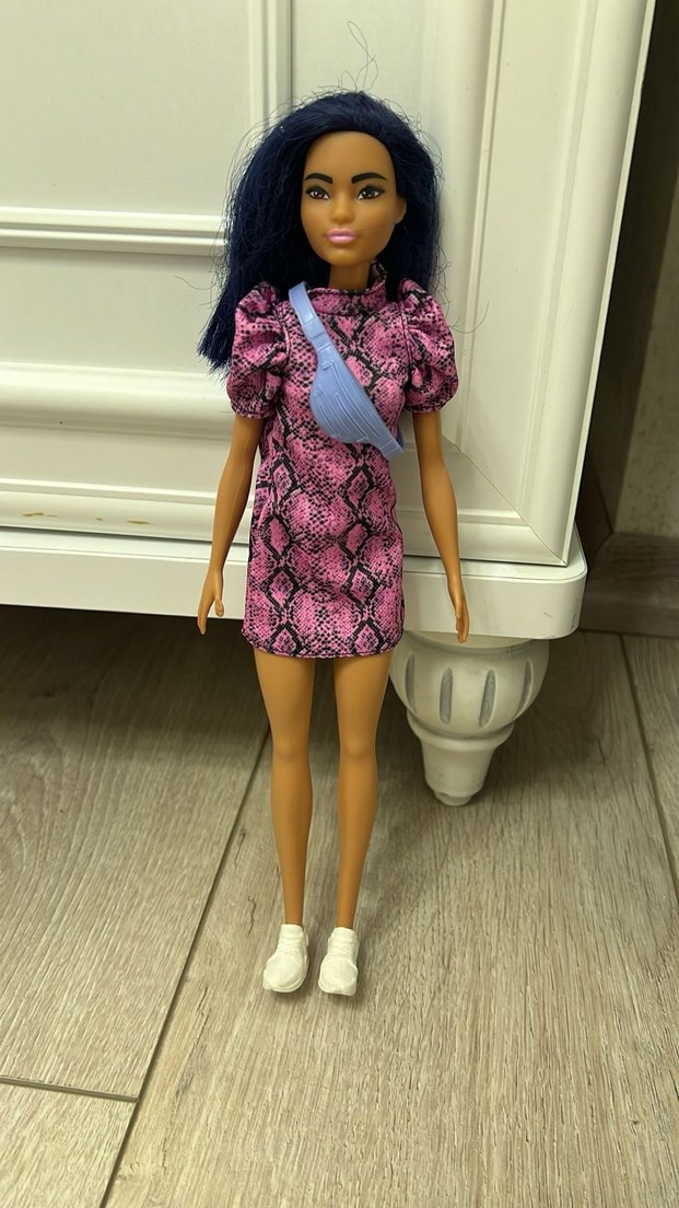 Bu bebek, kısa kollu pembe desenli bir elbise ve mavi çapraz çanta taşıyor. Koyu saçlı ve beyaz ayakkabılıdır.