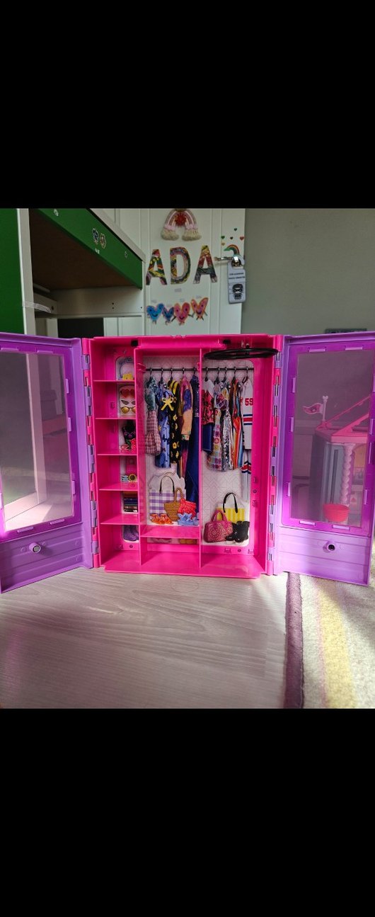 Renkli pembe çocuk dolabı, çeşitli bölmeler ve askılarla çocuk kıyafetleri ve aksesuarları için düzen sağlar.