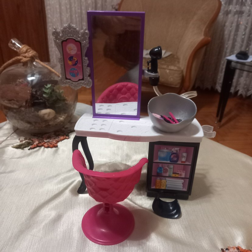 Lisanslı ürün. Orjinal Barbie. Pembe sandalye, beyaz tezgah, lavabo, ayna ve küçük raflı aksesuarlarla çocuklar için oyun kuaför seti. ♀️