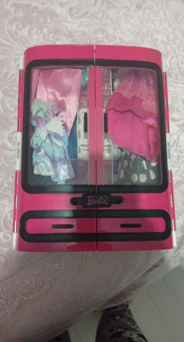 Koyu pembe renkte Barbie oyuncak gardırop, şeffaf kapakları ile içinde renkli elbiseler gösterir. Çocukların oyun zamanına uygun.