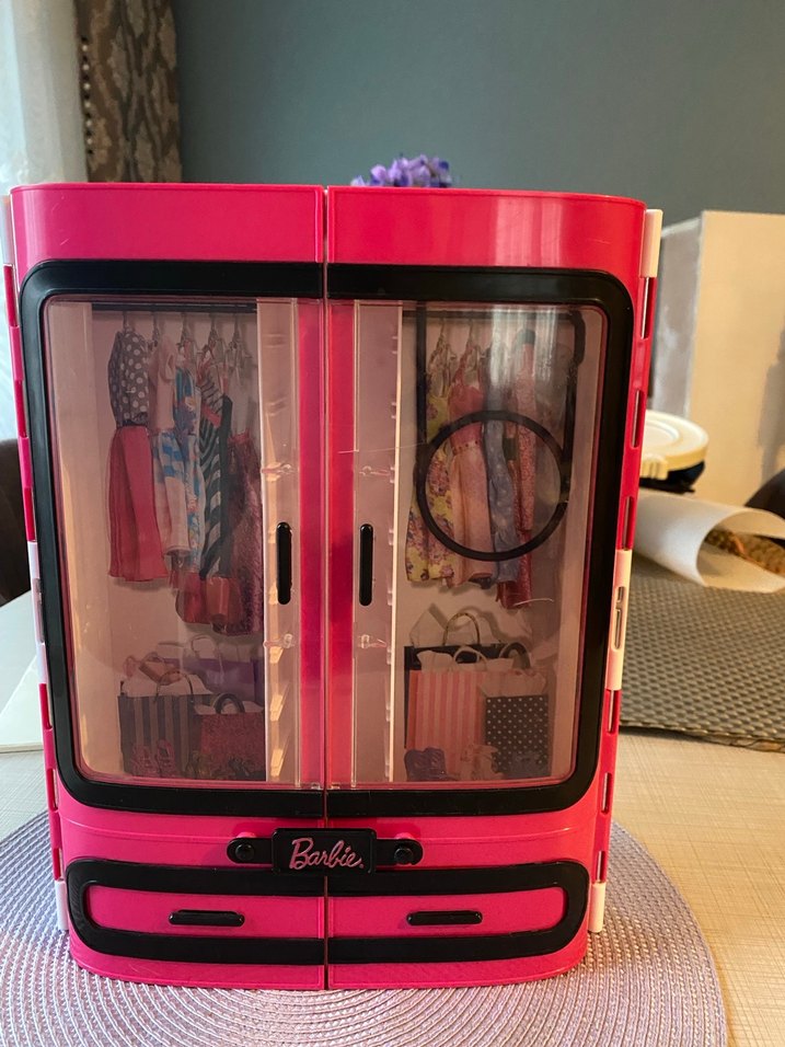 Pembe renkte, şeffaf kapaklı Barbie dolabı, içinde