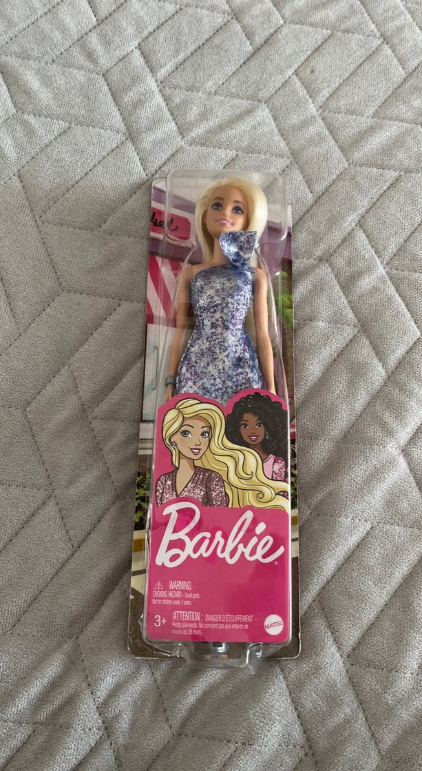 Barbie bebek, açık mor desenli elbise giymekte ve sarı saçlıdır. Barbie markalı kutuda paketlenmiştir. Kutunun bazı yerlerınde yıpranmalar vardır bilginize