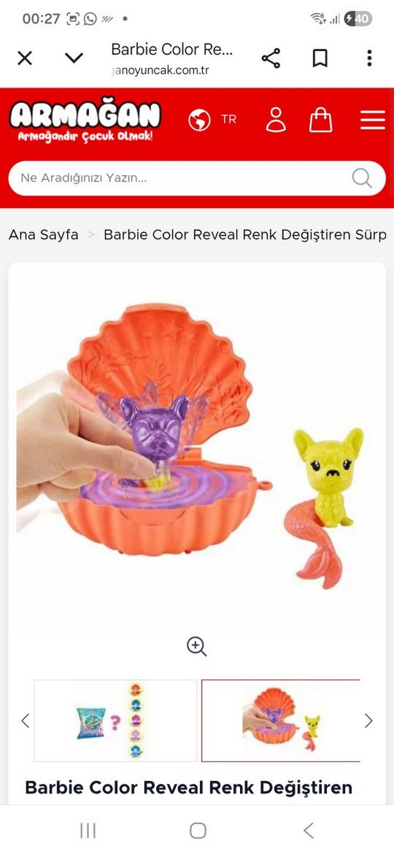 Fotoğraflarda görüldüğü gibidir, orjinal ve parçaları eksiksiz. Pastel pembe deniz kabuğu kutusu ve renk değiştiren küçük hayvan figürleri içeren Barbie Renk Değiştiren Sürpriz oyuncak.